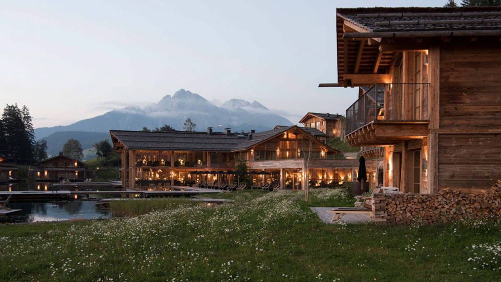 At night the lights of the cabins reflect in the water of the lake that the cabins surround. Apart from the lodges with luxurious interiors, there is a cosy restaurant and a swimming pool with a view of the mountains. What else do you need?