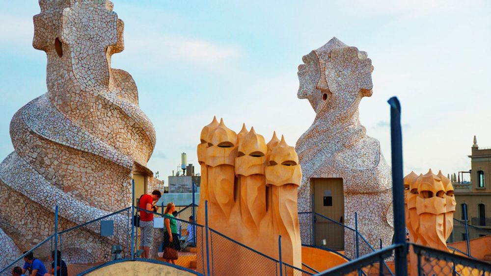 The interior of the building is characterised by a spiral staircase that leads you to the intricately decorated and designed rooms. Wavy ceilings, natural light through stained glass windows, and custom-designed furniture come together to create a masterpiece. The highlight of La Pedrera, however, has to be the rooftop. Coming onto the terrace is like transporting into another world with chimneys resembling faces, and stunning views over the rest of the city.